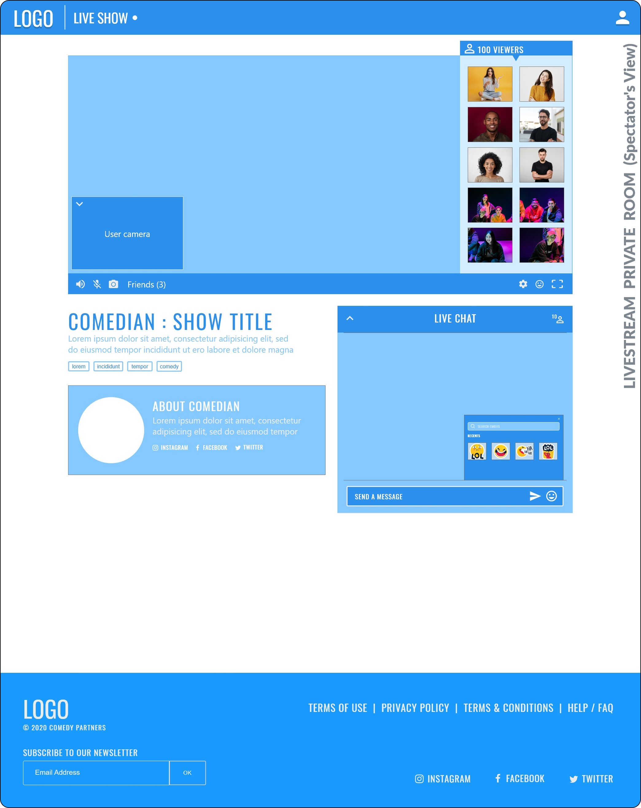 The goal of the early design phase was to identify and prioritize the core features needed by both comedians and spectators, while ensuring their experiences remained distinct. Initial exploration focused on key areas such as show discovery, live stream rooms, and navigation.