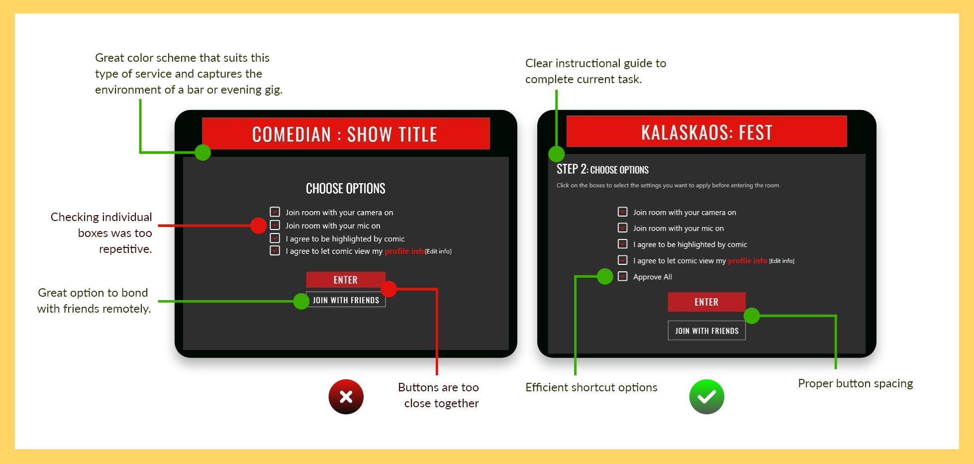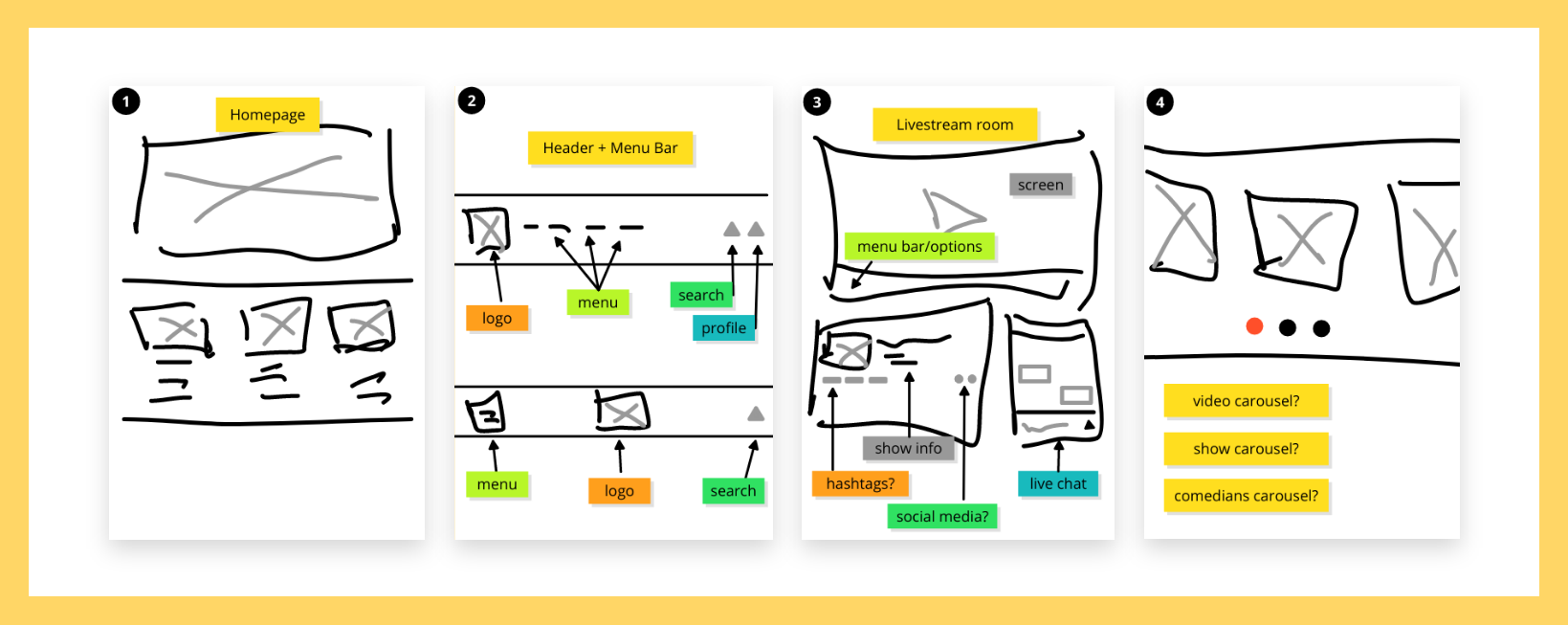 My main goal was to generate and prioritize features that both the comedian and spectator would need for their respective tasks such as the homepage, the live stream rooms, and the menu bar.