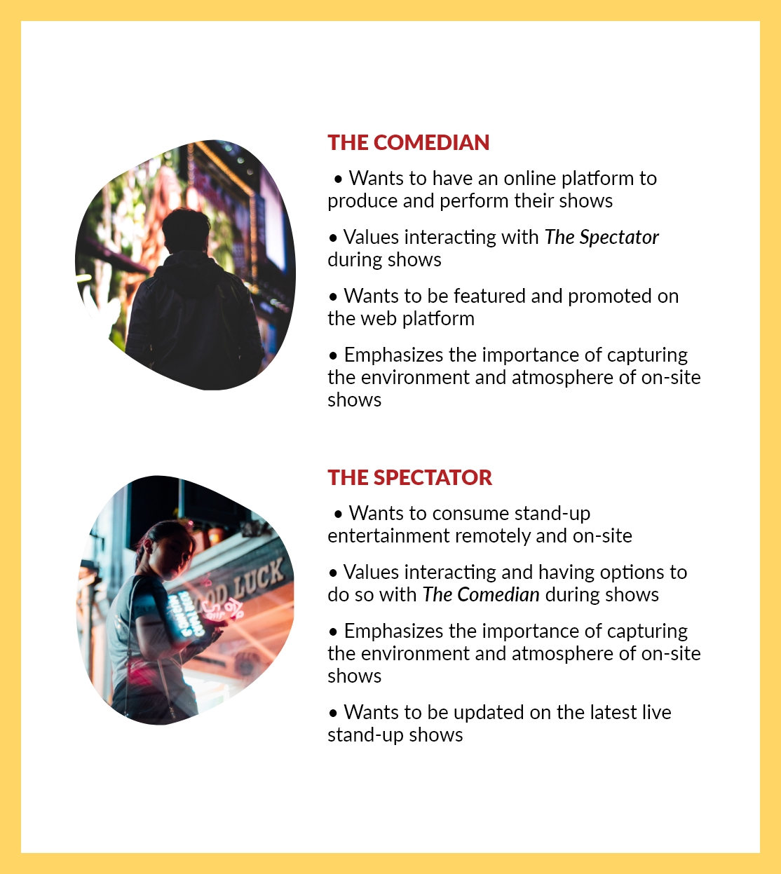 From the info we collected, we determined that our target user would be the Comedian and the Spectator.