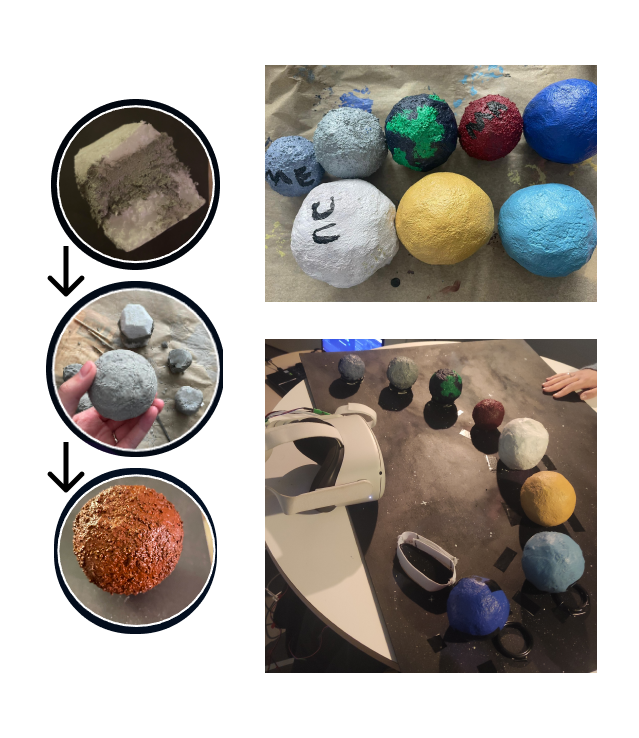 Adding to the immersion and sensory experience, we incorporated unique textures and weights into the physical models of each planet using styrofoam, modelling concrete, and sand. Thus, reflecting their unique size, density, and composition.